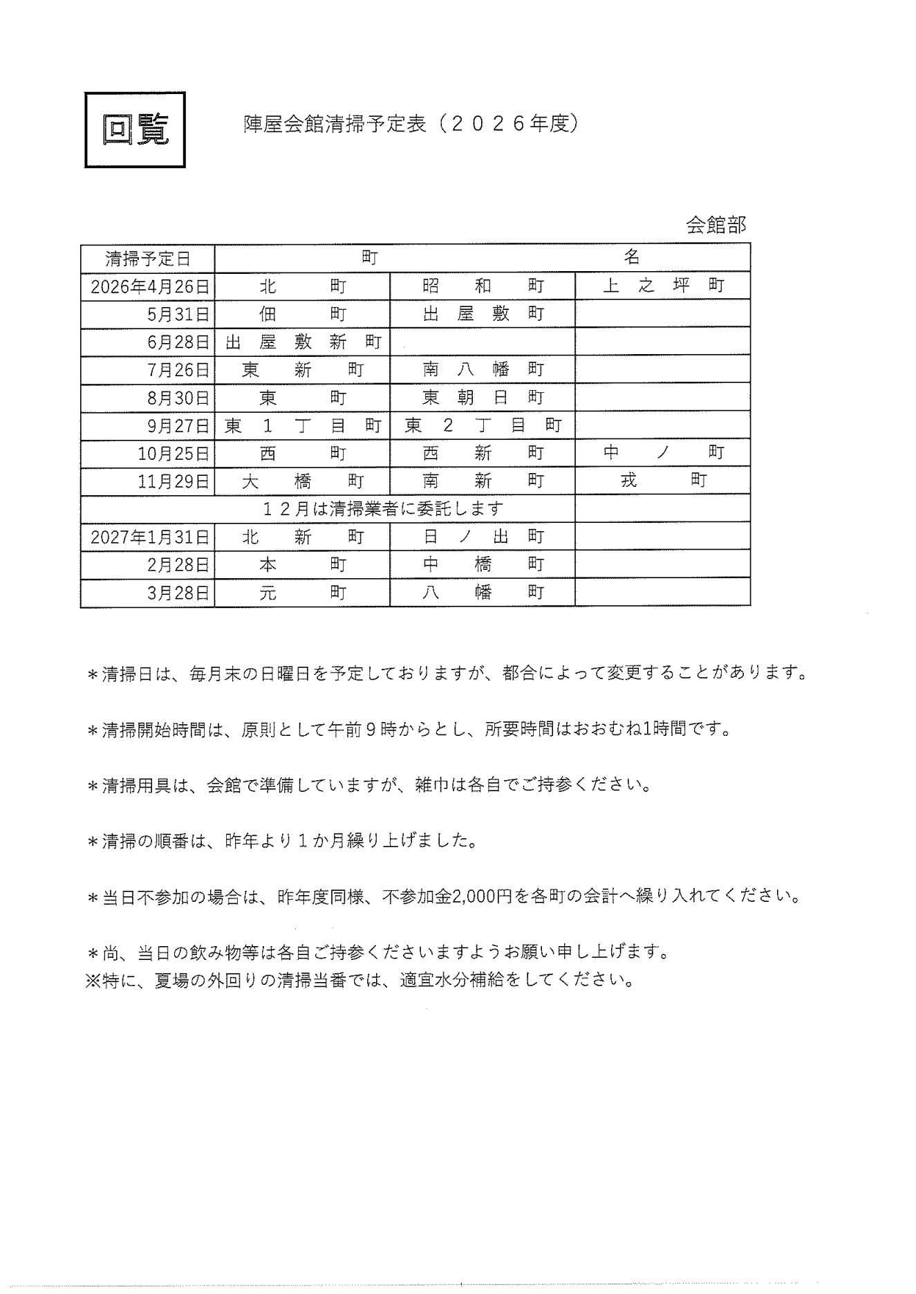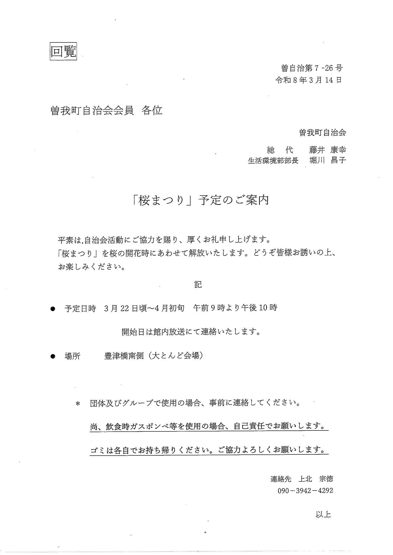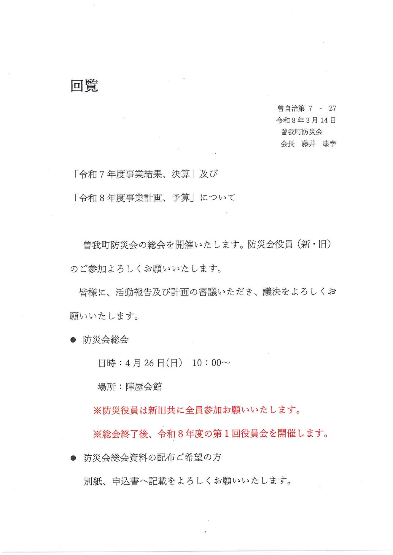 3月の回覧板 投稿日:2026年3月15日 作成者: boss1 桜まつり予定のご案内 防災会「令和7年度事業結果、決算」及び「令和8年度事業計画、予算」について 防災会総会資料 申し込み用紙 じんや食堂 オープンセレモニー開催のご案内 陣屋会館清掃予定表(2026年度) 歴史探報通信 Vol.24 ますが交番だより 3月号 訃報のお知らせ 大和御所道路曽我高架橋 下部工事ニュース 大和御所道路曽我高架橋 土曜日・日曜日・祝祭日 奈良県身体障がい者福祉事業