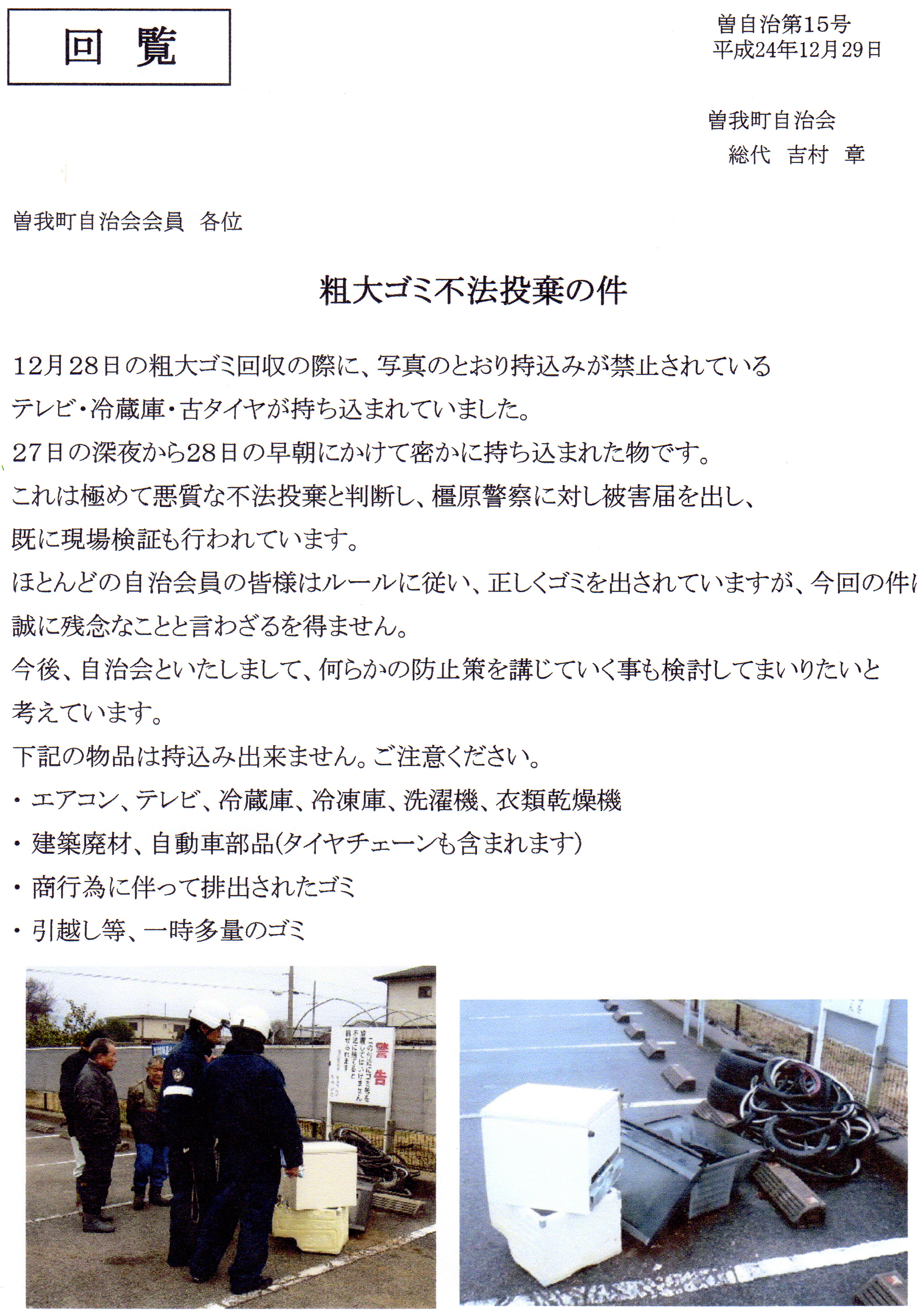 粗大ゴミ不法投棄の件 投稿日:2013年1月15日 作成者: admin 12月の粗大ゴミ回収時に、持ち込み禁止物品が不法に投棄されていました。 エアコンやテレビ・冷蔵庫・洗濯機・自動車部品 等は持ち込めませんので ご注意願います。