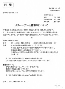 クリーンデーと露張りについて 投稿日:2014年4月6日 作成者: admin 5月11日(日)クリーンデーと露張りが実施されます。 クリーンデーの作業は午前8時から、露張りはクリーンデー終了後に実施をお願いいたします。