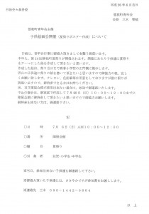 子供絵画会について 投稿日:2014年5月31日 作成者: admin 7月6日(日) 午前10時から12時の間、陣屋会館で子供絵画会を開催いたします。 夏祭りをテーマに、子供さんに絵を描いていただきます。作成した絵は夏祭りまで、小学校の正門横に掲示し、夏祭り当日は会場にて掲示いたします。 思い出作りに多くのお子様方の参加を、お願いいたします。